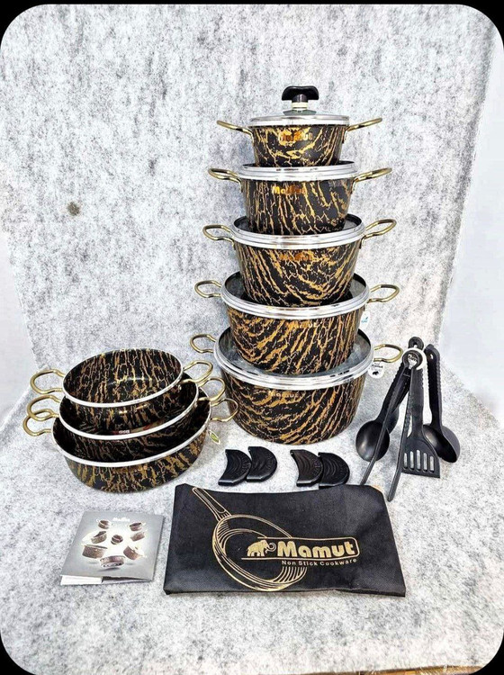 سایر توضیحات: ⚜️سایز قابلمه(16_20_24_28_32) ⚜️سایزتابه(20_24_28) ⚜️دارای استاندارد های کشور اتریش و انگلستان ⚜️دسته ها طلایی تولید شده با تکنولوژیpvd ⚜️به همراه کفگیر ملاقه_دستگیره سیلیکونی و پیشبند شرکت ماموت 🥇24ماه ضمانت شرکتی بی قید و شرط