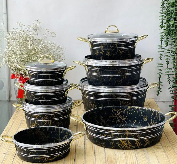 ساخته شده از پوشش نچسب داخل و بیرون گرانیت ❌️قابلمه ها سایز:(۲۸_۲۴_۲۰_۱۸_۱۶_۱۴) ❌️تابه ها سایز:(۲۸__۱۸)رنگ بندی:مشکی طلایی