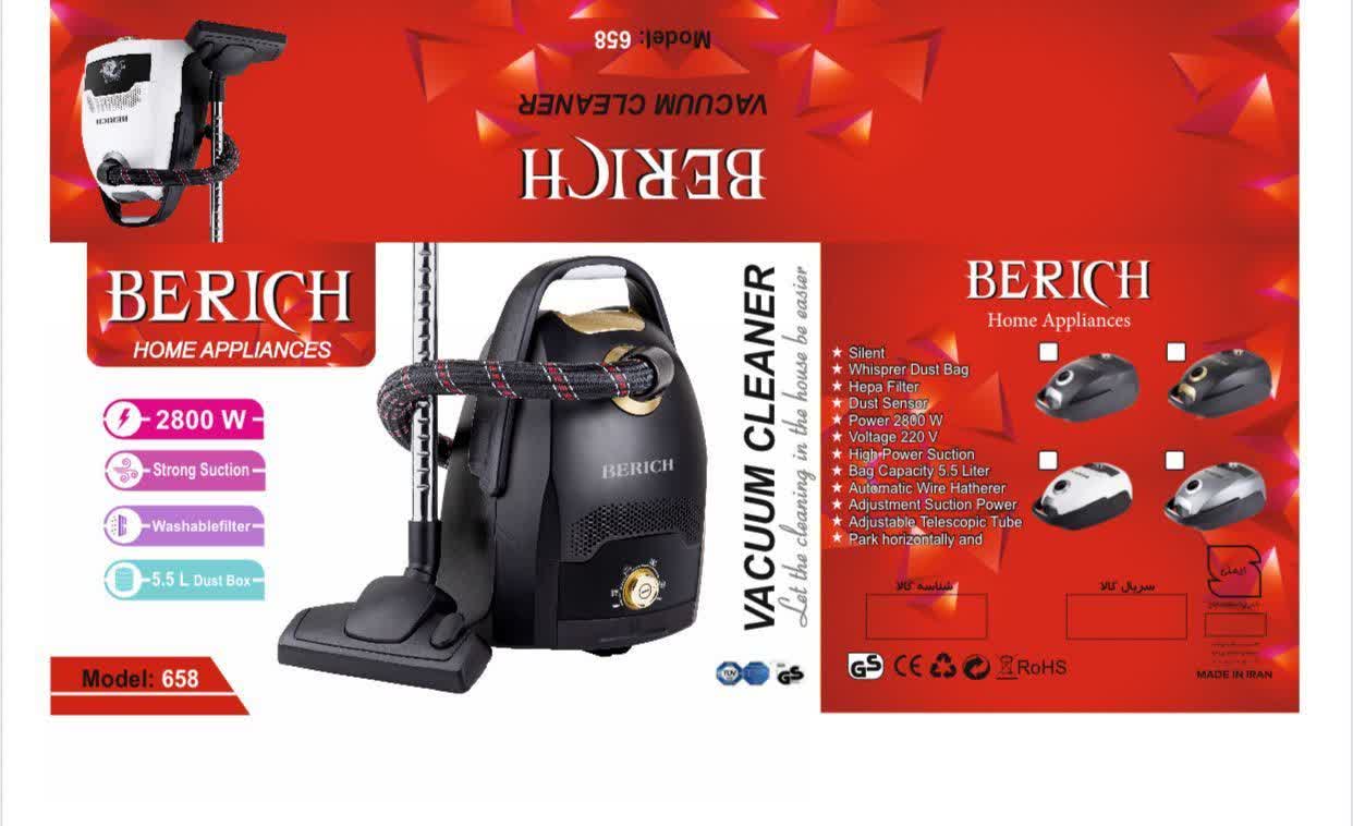 🔱جارو برقی سایز بزرگ بریچ صفحه آنالوگ(BERICH) ⚜️توان موتور2800وات ⚜️فیلتر قابل شستشو ⚜️مخزن5.5لیتری ⚜️مکش بسیار قوی ❌️رنگ بندی:مشکی_نوک مدادی_سفیدطلایی ✅️5سال ضمانت شرکتی✅️